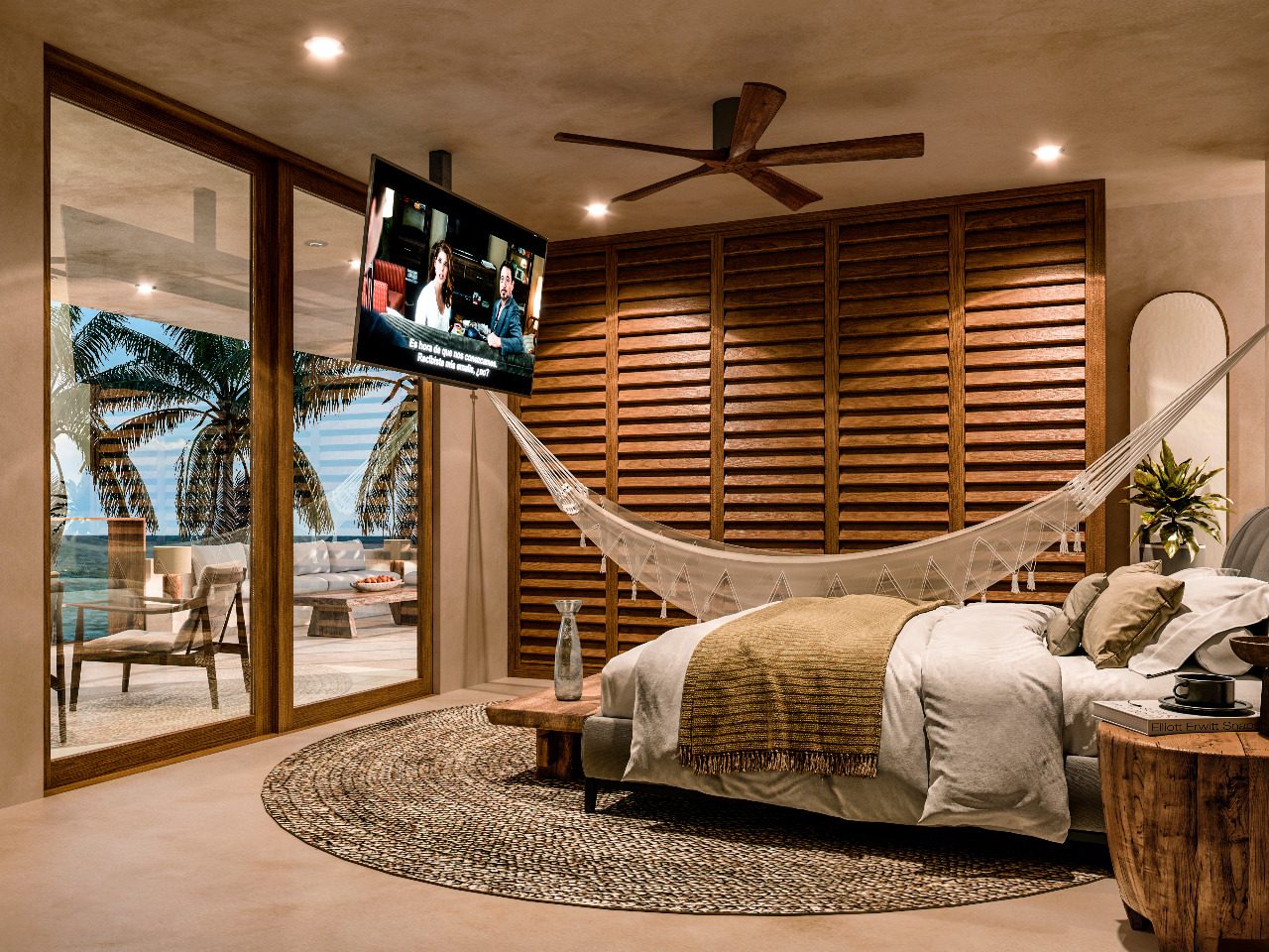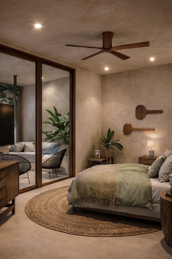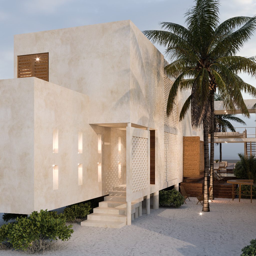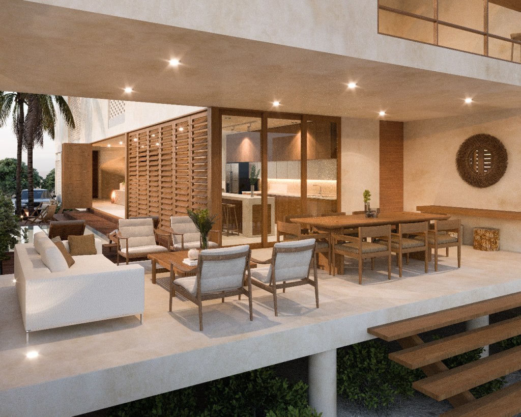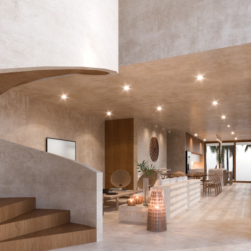 La propuesta material apuesta por una paleta neutra y atemporal, donde los muros en acabado de chukum aportan calidez y suavidad, mientras que la madera se introduce como elemento protagonista, generando contraste y acentuando puntos clave del proyecto. Este equilibrio material se refuerza con una arquitectura limpia, de líneas sencillas, que permite que la luz y las sombras definan los espacios.