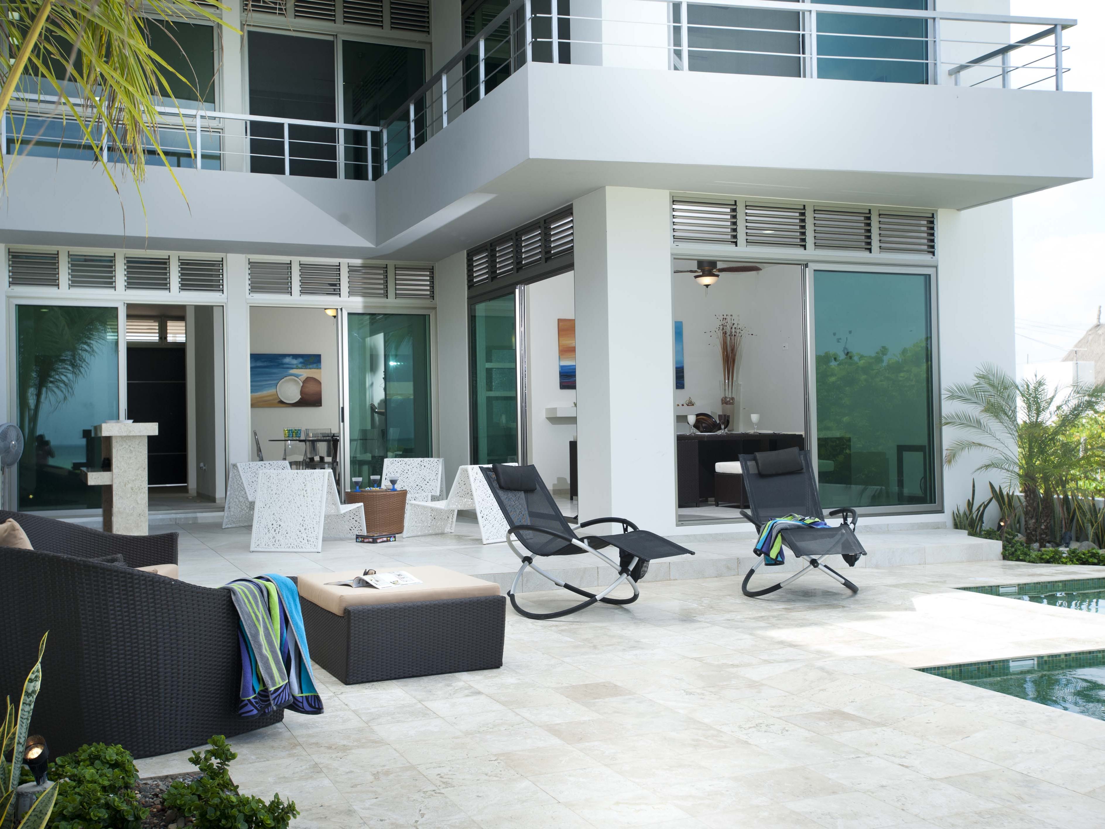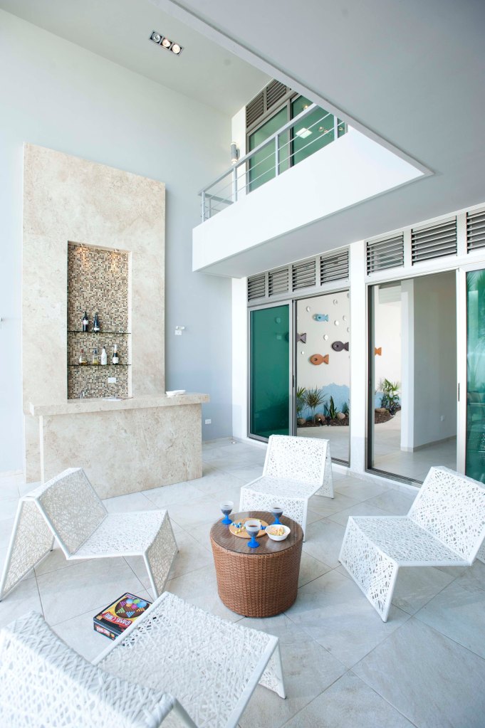 La arquitectura responde no solo a la estética, sino también al clima. La incorporación de louvers superiores en los ventanales favorece una ventilación cruzada constante, permitiendo que el aire fluya de manera natural y mantenga los espacios frescos sin depender exclusivamente de sistemas artificiales. Este recurso, además de funcional, aporta ritmo y ligereza a las fachadas.