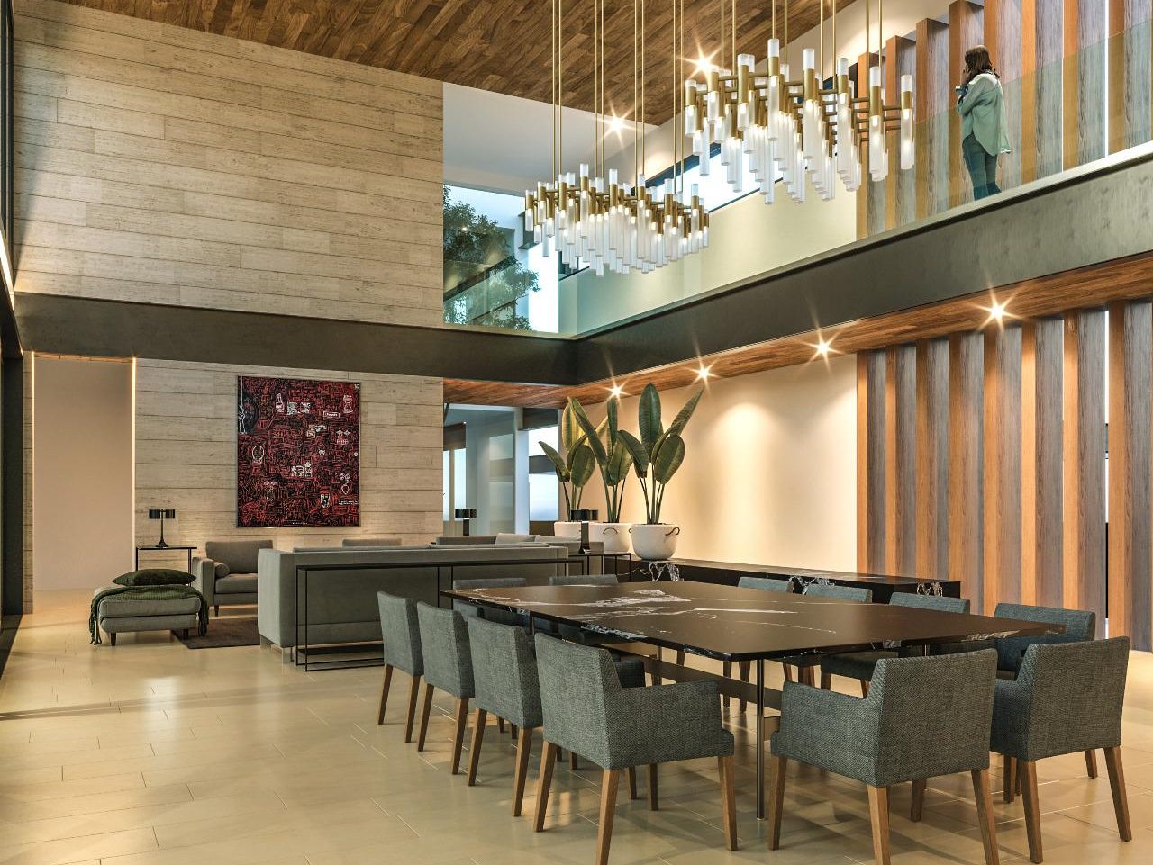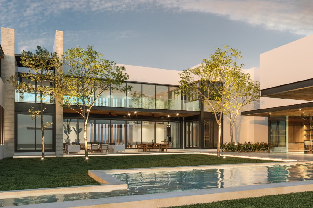 En contraste, el proyecto se abre completamente hacia el jardín posterior. Las áreas sociales se desarrollan en espacios a doble altura, favoreciendo la iluminación natural, la ventilación cruzada y una mayor sensación de amplitud. Esta apertura genera una relación directa entre interior y exterior, adecuada para el clima y estilo de vida.