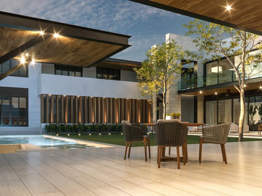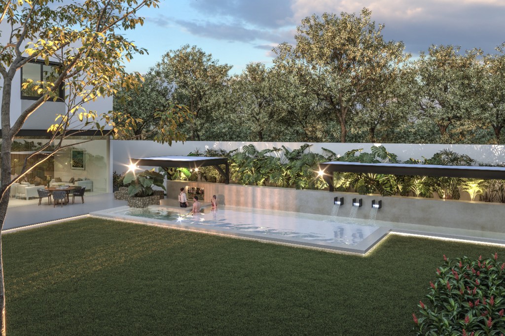 La distribución en esquema en “C” permite que todos los espacios principales se orienten hacia el jardín, consolidándolo como el elemento central del proyecto. Al fondo, una piscina se convierte en el remate visual del terreno, articulando las vistas y reforzando la continuidad espacial.